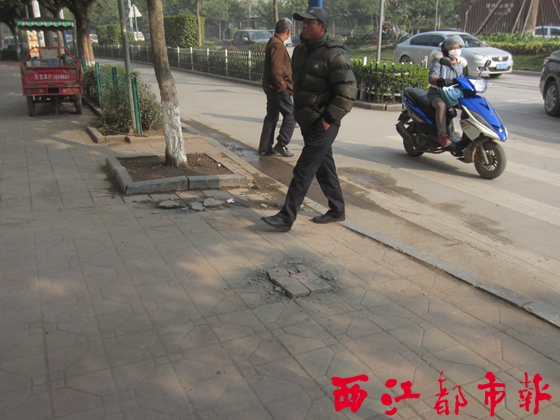????2月6日下午4點,記者在報料市民謬女士的指引下,來到香城商貿城附近人行道走訪。據記者觀察,該人行道出口于斑馬線的交接處被三道綠色的鐵網攔了起來。鐵網由兩根鋼筋固定,鋼筋則由水泥和螺絲釘固定在地面的磚塊上,另外,地面磚塊有碎裂現象。