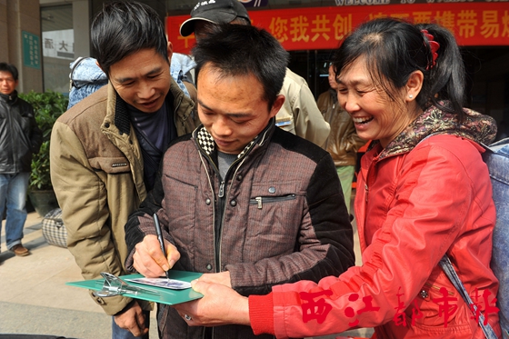 ????在當天的“讓愛回家”公益活動中,本報共為近百人次返鄉務工人員提供免費拍照服務。拿到照片后,他們紛紛在照片的空白處寫下了新年的祝福,盡管這些祝福內容各不相同,但一致的是對美好生活的期許。“謝謝你們,謝謝梧州,想不到在回家的路上還能收獲到這么一份特殊的禮物!”來自貴州貴陽的返鄉農民工盧和英把照片小心翼翼地放到手提包內,向本報記者表達由衷的謝意。
