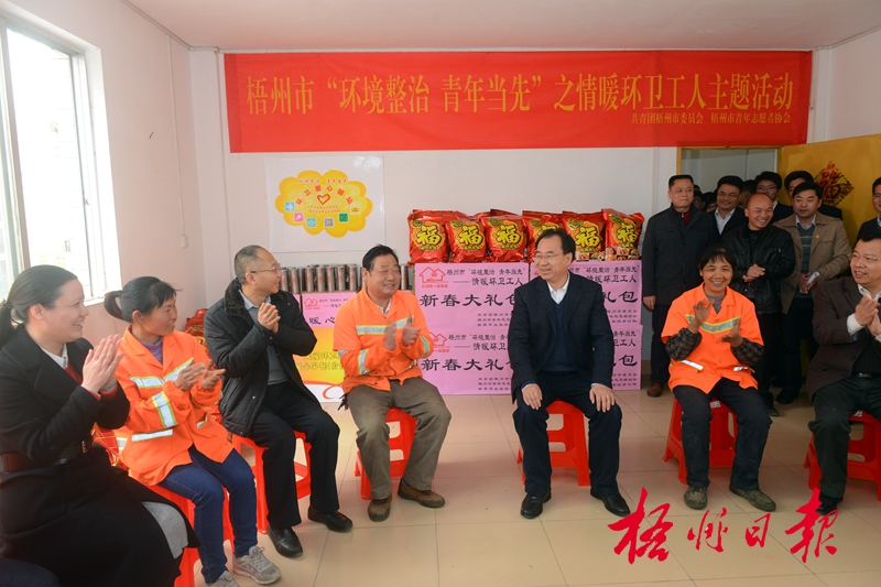 ??? 梧州日報訊(記者 李欣鞠) 2月9日下午,市長朱學慶分別看望慰問了一線市政工人和環衛工人,向他們送上新春的問候和祝福。