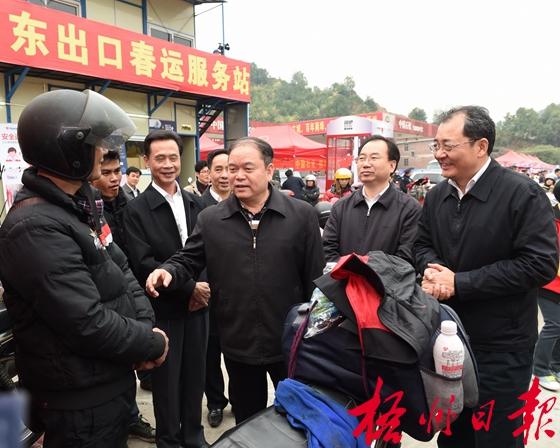 2月14日上午,自治區人大常委會副主任、自治區總工會主席王躍飛(右一),廣東省人大常委會副主任、省總工會主席黃業斌(右三)在梧州市市長朱學慶(右二)的陪同下,到東出口春運服務站慰問返鄉務工人員和春運服務人員,為他們送上新春的問候和祝福。 去年12月,廣東、廣西兩省區工會組織達成省際聯動雙向維權機制,并合作開展春運服務“暖流行動”。 孟亞西 攝