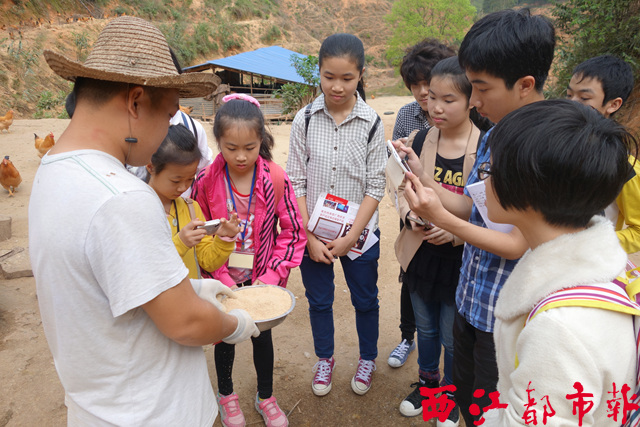 ????經(jīng)過近20分鐘的徒步,小記者們終于到達(dá)三黃雞養(yǎng)殖基地。此時(shí),基地內(nèi)的工作人員黎炳耀正在給雞只喂食。充滿好奇的小記者們顧不上路途的辛苦,立刻圍在黎炳耀身邊,并掀起一撥撥提問攻勢(shì):“叔叔您好,我是梧州日?qǐng)?bào)社的小記者侯晴,請(qǐng)問這個(gè)基地面積多大?”“我想了解這里的三黃雞較市場(chǎng)上其他的雞只在品種上有什么特別之處?”“你一天工作多久時(shí)間啊?”……