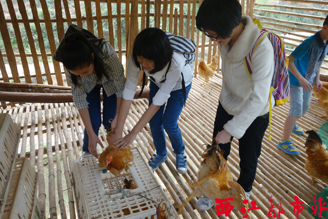 ????當(dāng)天上午10時(shí),在老師的帶領(lǐng)下,10名小記者來(lái)到位于蓮花大橋附近的新粵西樓紙包雞專用三黃雞養(yǎng)殖示范基地。可是,車子剛停穩(wěn),基地入口處的一塊標(biāo)識(shí)牌就讓部分小記者“傻了眼”。原來(lái),該入口距離基地還有兩公里,且由于客觀因素,小記者們只能是步行進(jìn)入。“還好,我?guī)Я怂惋灨伞!奔?xì)心的小記者白梓晴在出發(fā)前已有所準(zhǔn)備。這時(shí),小記者巫納謙也不甘“示弱”,說:“我平常有練習(xí)羽毛球,兩公里的路程難不倒我。”