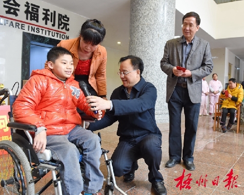 ????2月9日,市委書記、市人大常委會主任黃俊華到市社會福利院,看望慰問那里的老人、孤殘兒童和工作人員。黃俊華為肢殘兒童吳振皓拿起麥克風,鼓勵他唱出心中的喜悅與憧憬。孟亞西 攝