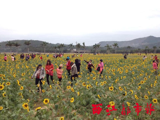 ????西江都市報訊 (記者 高云 通訊員 莫卓昕) “哇!好美!快過來我們一起拍個照。”當岑溪市糯垌鎮現代特色農業核心示范區百畝盛開的油葵花出現在大家眼前時,500多名來自梧州市區的游客不禁發出連聲驚嘆。