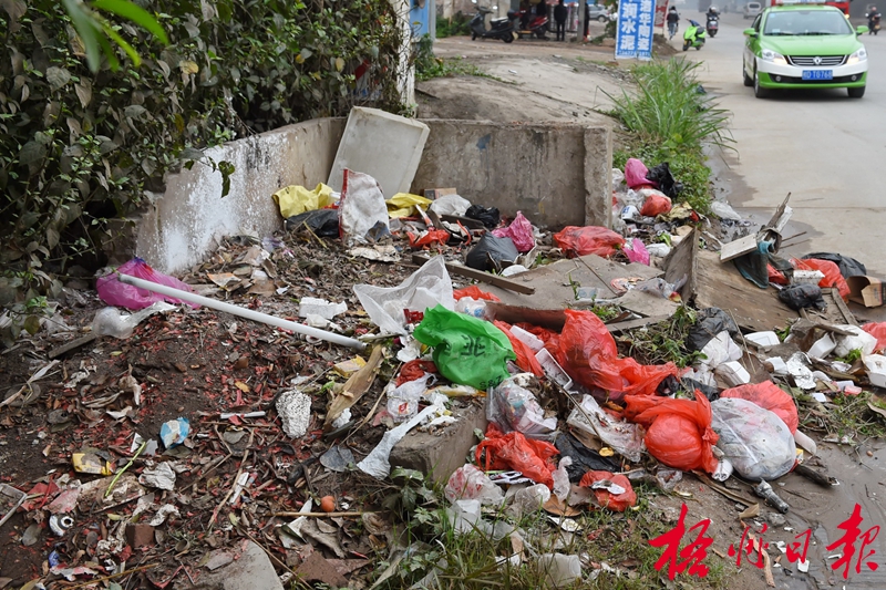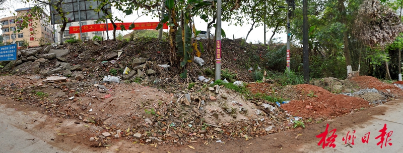 在轉入萬秀區(qū)夏郢鎮(zhèn)的道路路口,綠地成了垃圾場,堆滿生活、建筑垃圾。孟亞西 攝