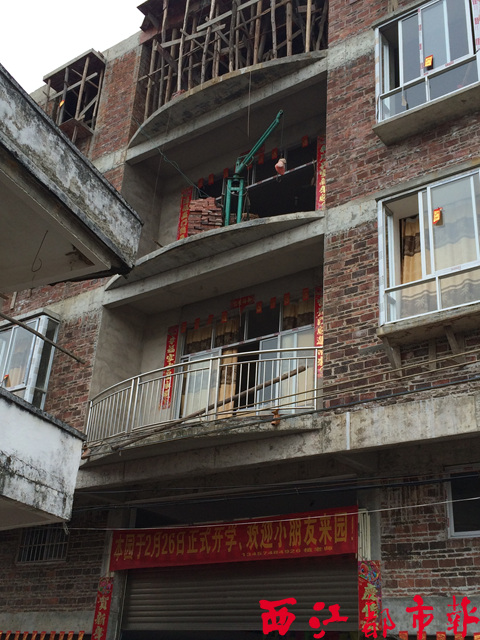 ????3月1日,長(zhǎng)洲區(qū)教育局和倒水派出所組成聯(lián)合執(zhí)法組前往倒水鎮(zhèn)富萬村進(jìn)行調(diào)查取證。當(dāng)執(zhí)法組來到這家幼兒園時(shí),幼兒園的老師和兒童正在上課,而上課的環(huán)境則讓執(zhí)法人員驚出一身冷汗。這棟四層高的私人樓房仍在施工建設(shè)中,三樓陽(yáng)臺(tái)連護(hù)欄都沒有,還堆疊著大量磚頭和鉤機(jī),而四樓則剛搗制樓頂,且沒有安全網(wǎng)隔離,磚木隨時(shí)有可能掉落,存在嚴(yán)重安全隱患。