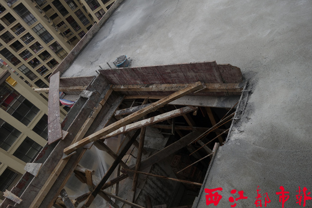 ????當天上午10時,記者來到御山帝景小區走訪發現,出現違建的地方位于該小區7棟1單元1801房。該業主在其住所天臺搗制了混凝土加層。盡管該頂層加建部分仍舊用三色布覆蓋,但其混凝土框架已經完成。