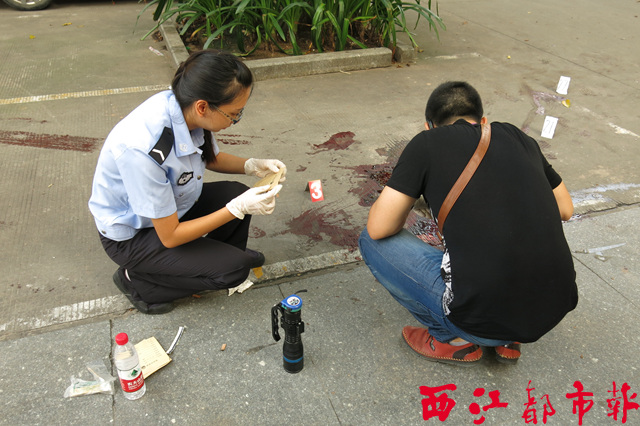 去年夏天的一次出警,女法醫王務(左)和同事在案發現場提取地上的血樣。