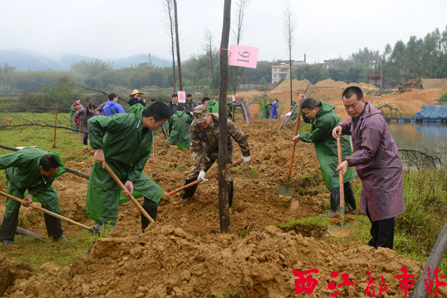 ????西江都市報訊 (記者 龍?zhí)靷鳎?3月12日,是一年一度的植樹節(jié)。當天,梧州市黨政軍領導及220多名機關干部群眾,來到夏郢鎮(zhèn)鎮(zhèn)安村開展深化“四百”行動續(xù)掀“生態(tài)鄉(xiāng)村”活動高潮現(xiàn)場會暨植樹節(jié)活動,共建美麗梧州。