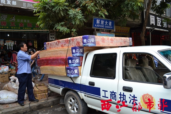 工商局執(zhí)法人員扣留尚未銷售的涉嫌侵權(quán)“晚安”注冊商標床墊及商標標識等物品