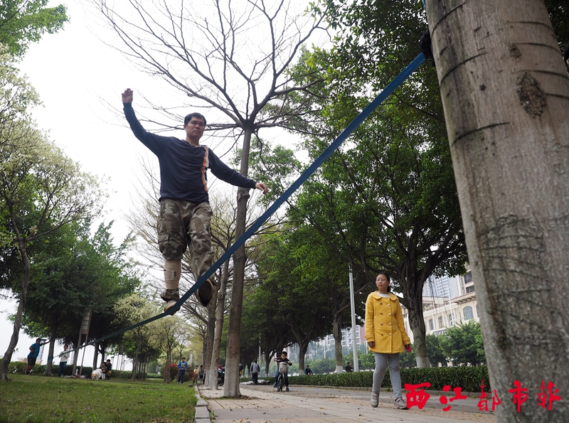 ???? 3月15日下午,一名戶外愛好者在西堤路綠化帶的樹木之間走扁帶,引來路人的觀看。