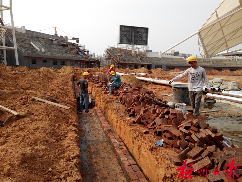 3月18日,在紅嶺體育場主場館內,工人在砌筑排水渠。目前,體育場總體工程已完成80%。李欣鞠 攝