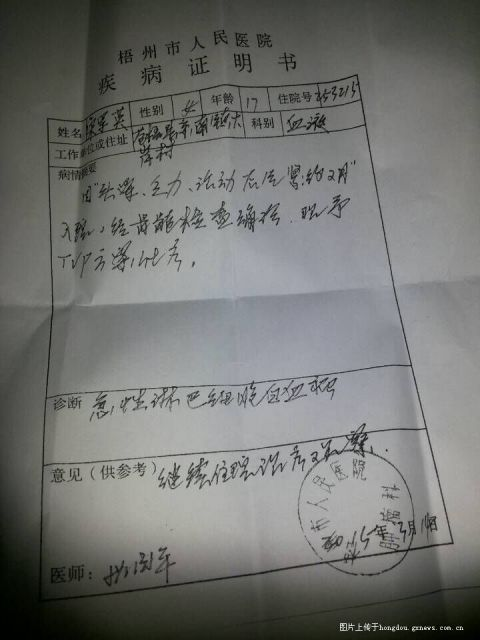 宋軍英,就讀于蒼梧中學,今年春學年,她和同學們一起投入緊張的復習當中,用自己的努力去追逐自己的大學夢。她家庭并不富裕,家里兄弟姐妹五人,她排第三,哥哥和姐姐都在讀高三,一個弟弟讀高一,另一個弟弟讀初三。家里只有一兩畝水田,現母親在餐廳做服務員,其父在家里務農。宋軍英一家靠父母種田和打散工的收入維持簡單的生計,日子過得非常艱難。宋軍英珍惜著自己的這份幸福,乖巧懂事,孝順父母,認真學習。可是就在夢想快要接近現實的時候,卻來了個晴天霹靂。3月15日,宋軍英不幸被確診患了急性淋巴細胞白血病,生命危在旦夕。而突來的噩耗對于這個困難的農村家庭來說,是雪上加霜,高昂的醫療費用,讓宋軍英同學一家束手無策,只好求助于社會。