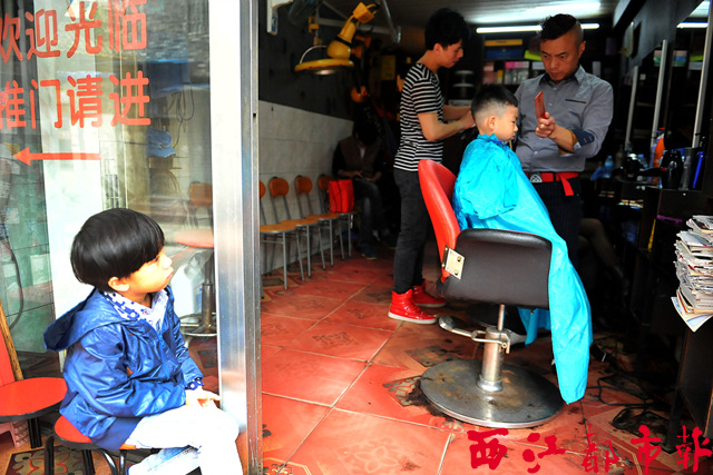 ????3月21日,在梧州市東正路一家發(fā)廊外,一位小朋友在等待理發(fā)。