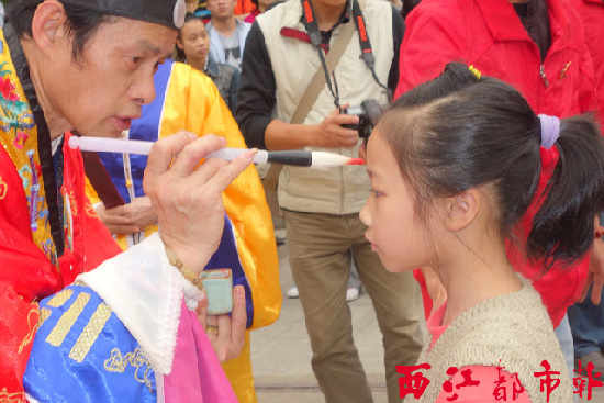 3月22日,梧州市龍母廟一位工作人員用朱砂在孩子額頭正中點上紅痣,為孩子進行開筆禮儀式。高云/攝