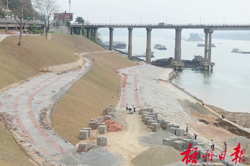 ????據了解,河東防洪堤護岸整治改造工程從下關排澇閘室至云龍橋。目前,三級親水景觀平臺已經顯現,部分平臺已完成水泥硬化。堤岸的彩色人行道已完成大部分道路的鋪設,工人正在忙碌地進行草皮種植、護欄安裝、砌建綠化帶等工作。 李鴻榮 攝