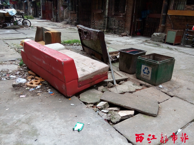 ????3月31日,記者跟隨角嘴街道辦、新興社區人員來到新興一路78-81號居民樓前,看到這里位于兩排居民樓之間的空地上有十多塊明渠蓋板,有的已經凹陷變形,有的已經裂成幾塊。而有的渠道口已經沒有了蓋板,污水和臭味不斷從明渠冒出。在損毀最嚴重的明渠蓋板處,有幾個爛沙發橫七豎八地堆放在上面。“這些沙發是附近居民搬來的,防止居民踩到這些爛蓋板上會發生危險。”新興社區主任陳燕玲說。