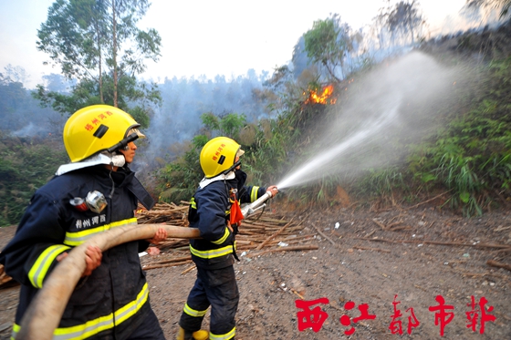 ????事發(fā)后,梧州公安消防支隊指揮中心立刻調集市區(qū)河東中隊、河西中隊、長洲中隊、水上中隊、特勤中隊前往增援,并于當天15時08分相繼到達現(xiàn)場。按照指揮,消防官兵將現(xiàn)場劃分為四個點戰(zhàn)區(qū),分別在梧州學院宿舍樓、體育館、山腳木材加工廠、加油站設置四個水槍陣地開展滅火工作,及時阻止火勢往山腳方向蔓延。