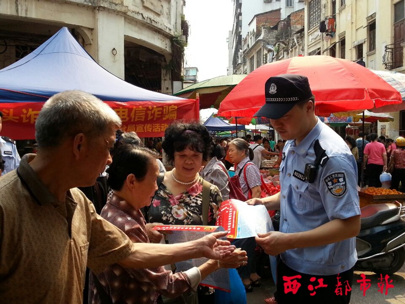 ??? 4月4日上午,萬秀區公安分局刑偵二大隊民警走進萬壽宮菜市和大東菜市,向市民傳授預防街頭詐騙和電信詐騙知識。