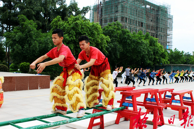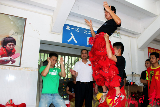 鄧彬光在指導(dǎo)師弟們舞獅。