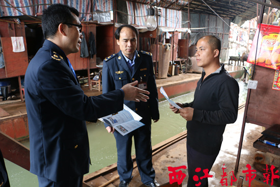 ????4月7日,梧州航道管理局人員正在向昭平轄區內的一艘采砂船的船東宣傳《中華人民共和國航道法》。