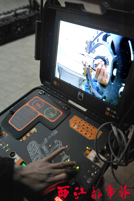 ????記者觀察發現,這臺T5排爆機器人除了擁有靈巧的機械手用以鉗取爆炸物外,它全身共有六個攝像頭,分別位于“身體”的前部、后部、機械手等。排爆民警只需在遠離爆炸物的操控臺上輕輕切換、搖動對應的操作按鈕,就可全景觀察到周圍的環境,根據排爆現場的情況做出相應的處置。