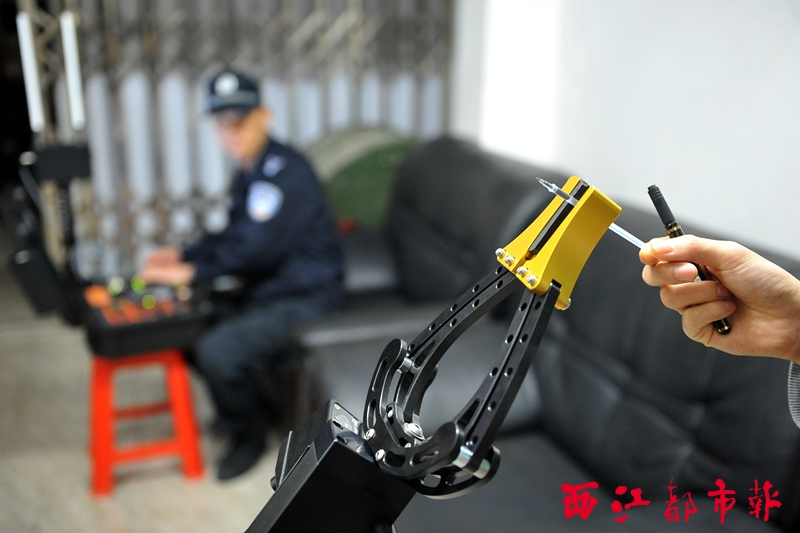 機器人的機械手能干重活也能干細活,在民警的遙控下,機器人輕易夾起了幾毫米粗的簽字筆芯。???