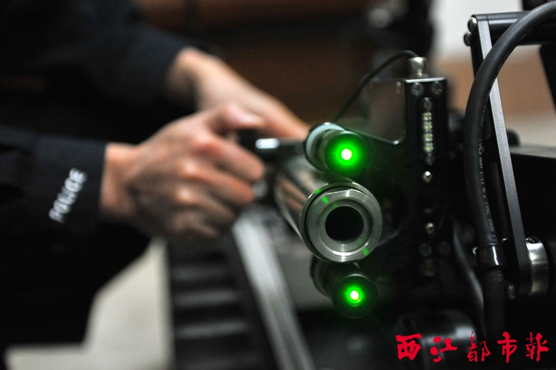 ????作為一位“全能型”機器人,沒有一套武器系統那肯定說不過去。范瑜輝介紹,T5排爆機器人擁有四個獨立的開火電路和兩組激光瞄準器,可裝配一支霰彈槍或水泡槍。如果遇到不能轉移的爆炸物,民警可在操控臺上擊發水泡槍,直接把可疑爆炸物用瞬間高壓水流或霰彈沖碎,從而避免發生爆炸。