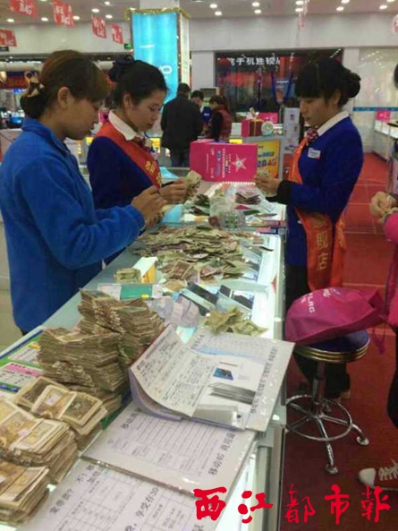 ????李夏說(shuō),自己店鋪?zhàn)猿闪⒁詠?lái),從沒(méi)遇到過(guò)顧客拿這么多的零鈔來(lái)買(mǎi)手機(jī)或交話費(fèi),為了尊重顧客,她當(dāng)即表示“收”。