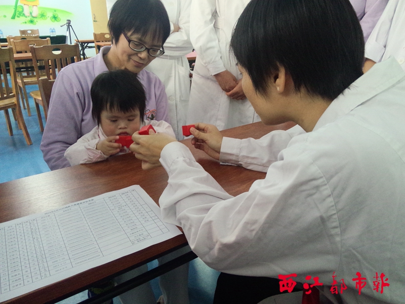 ????課堂上,康復評估師用積木、杯子等評估器皿與小朋友進行小游戲,觀察小朋友的細節動作和反應,對小朋友的智力水平作出評估。與課人員進行觀摩后表示受益匪淺。