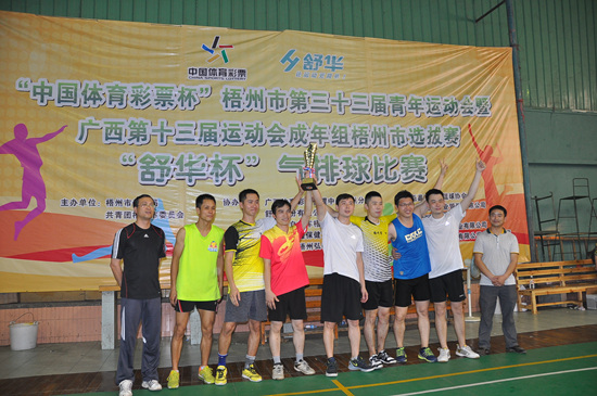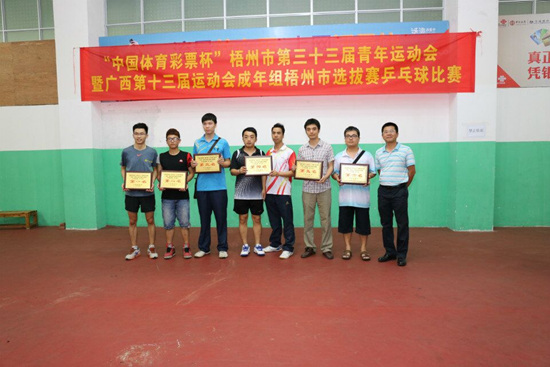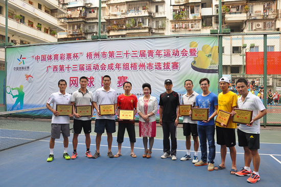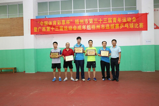 梧州市體育局副局長(zhǎng)譚漢忠與男單獲獎(jiǎng)選手合影留念