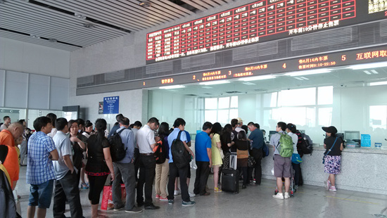 4月19日,在南廣鐵路梧州南站,游客正在排隊購買車票。 “三月三”小長假期間,許多市民乘坐動車外出探親或旅游,梧州南站售票處和候車室的客流量比往日明顯增加,車站通過增開售票窗口、增加安檢設施、增派人力等措施,幫助旅客順利出行。 祝琳 攝