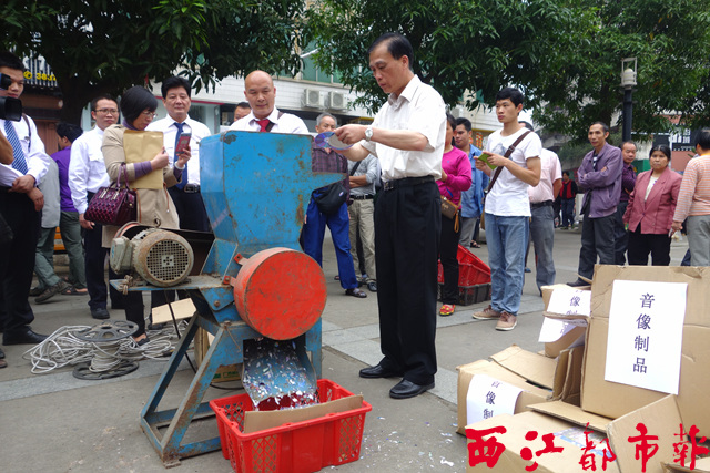 ????西江都市報訊 (記者 高云 通訊員 李敏) 4月24日上午,在梧州市潘塘公園,工作人員將非法音像制品放入粉碎機中銷毀。當日,梧州市“掃黃打非”工作小組在2015年全區侵權盜版及非法出版物集中銷毀活動梧州市分會場,現場銷毀3000多件非法音像制品、書報刊和電子出版物。