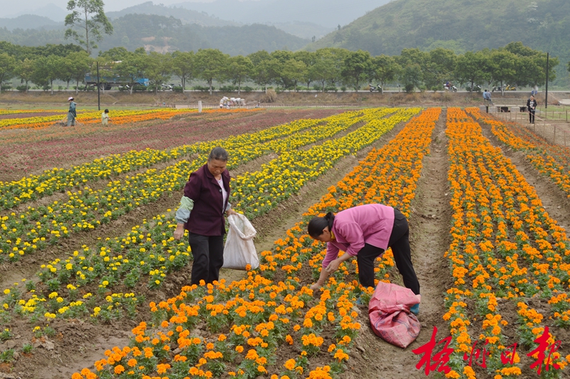 ??? 4月25日,在蒙山縣蒙山鎮北樓村農業觀光園,花農在護理連片種植的花卉。