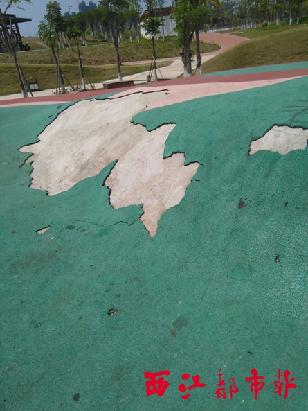 ????西江都市報報料熱線報道(記者 謝韻)隨著公共設施不斷完善,蒼海公園吸引越來越多市民前往游玩。日前到蒼海公園游玩的梁先生發現,該公園內的塑膠地面遭到破壞。對此,有關方面表示,會盡快修復公園內受損的公共設施,同時希望市民文明游園。