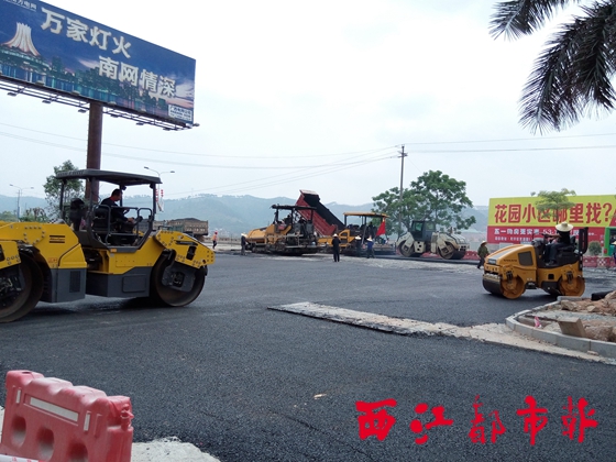 ????而在帝龍大酒店對(duì)出路口的施工現(xiàn)場(chǎng),18輛瀝青混凝土的運(yùn)載車、4輛壓路機(jī)與3輛攤鋪機(jī)正在來回忙碌著。運(yùn)載車先把150℃高溫的瀝青混凝土倒進(jìn)攤鋪機(jī),然后攤鋪機(jī)邊移動(dòng)邊把瀝青混凝土一字?jǐn)傞_鋪設(shè)在路面上,接著滾筒壓路機(jī)邊壓邊往瀝青上滴水。施工方廣西建工集團(tuán)第五建筑工程有限公司項(xiàng)目現(xiàn)場(chǎng)負(fù)責(zé)人吳德勇介紹說,目前正在鋪設(shè)第一層8厘米厚的瀝青,每天能鋪兩至三公里,計(jì)劃5月5日后開始鋪設(shè)第二層4厘米厚的瀝青,屆時(shí)速度將會(huì)是目前的2倍。