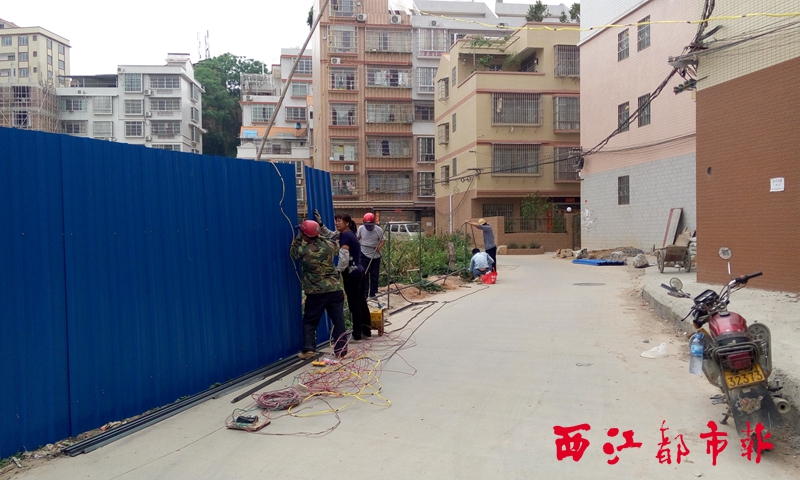 4月27日,興龍辦事處的工作人員在通往丫塘山小區的村道上立起了一道鐵皮“墻”。本報記者 龍天傳/攝
