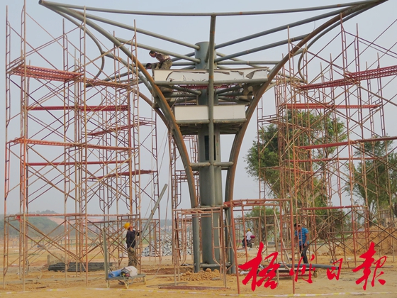 ????4月26日,記者在園博園旅游基礎設施建設項目現(xiàn)場看到,多名工人正在蒼海湖西岸主入口片區(qū)的騎樓廣場上焊接騎樓花架結構。據介紹,這些高約10米的不銹鋼材質傘狀花架將成為騎樓廣場的標志性景觀物,花架借鑒騎樓的造型特征,并在頂部種滿梧州市花寶巾花,以突顯本地元素和特色。此外,園博園跨湖人行橋工程、園博園梧州展園、蒼海湖西岸綠化和地磚鋪設、道路硬化等工作也在抓緊開展。