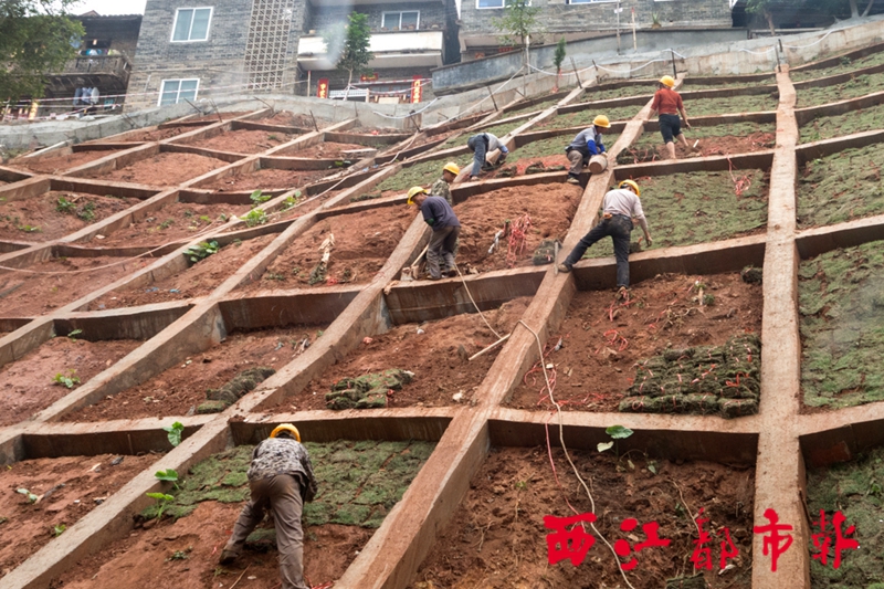 ??? 近日,施工人員在藤縣藤城中心校后山邊坡進行植草皮施工。