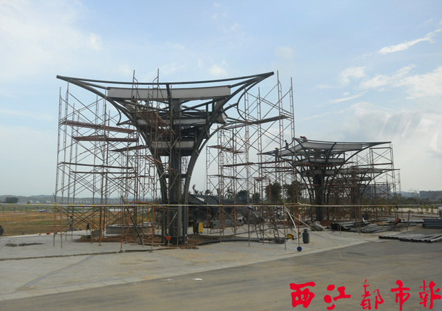 ??? “五一”小長假期間,蒼海湖西岸的工地上,施工人員正在搭建花架,這是園博園工程項目之一。施工完畢后,這些不銹鋼傘狀的花架將成為蒼海湖騎樓廣場上的標志景觀。西江都市報記者 蒙紹松/攝