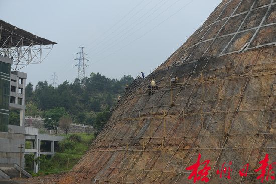 ????5月6日,在在建的市網(wǎng)球中心,工人正在整治場(chǎng)館周邊護(hù)坡。