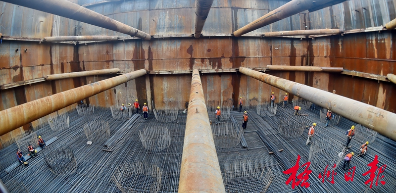 ??? 5月8日,在環城高速公路扶典口西江特大橋1號主墩封底面層,工人們正安裝鋼筋。