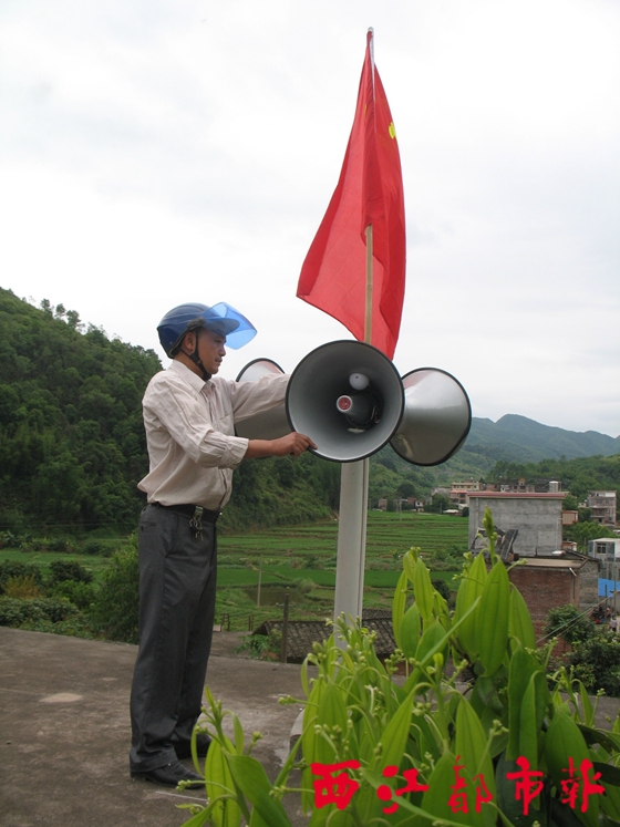 ??? 5月13日,技術(shù)人員在藤縣埌南鎮(zhèn)黎寨村一樓頂,安裝并調(diào)試山洪預(yù)警告警器廣播系統(tǒng)的高音喇叭。