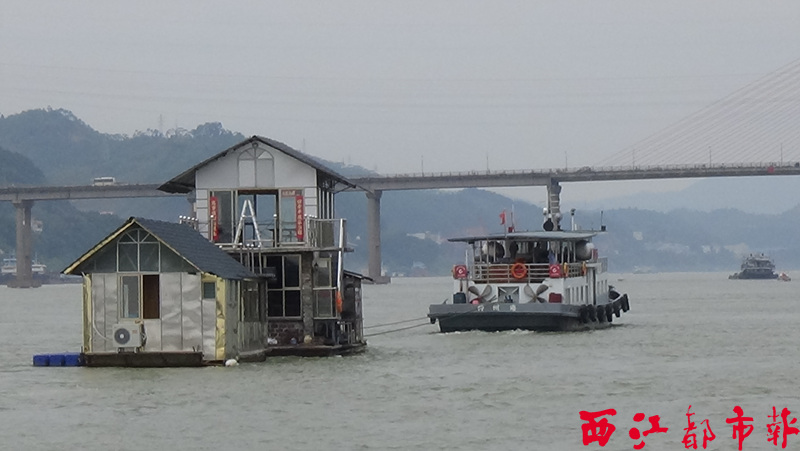 近日,梧州市江河水位上漲,為確保水上交通安全,5月15日,梧州市港航管理處聯合梧州海事局等有關部門組成汛期水上巡查隊,調來拖輪將桂江河面的排筏拖移到安全區域。(朱元冬 武紹軍 攝影報道)