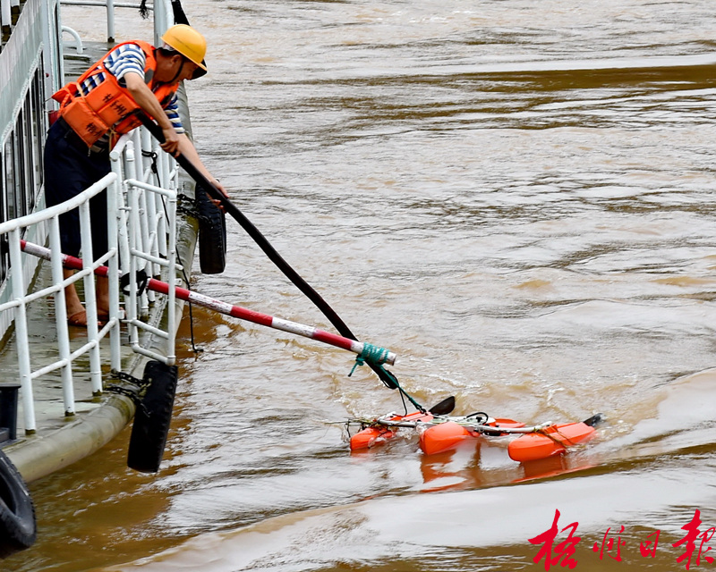 ????5月22日,水文部門工作人員使用相控陣測流儀在西江水域監(jiān)測江水流量。