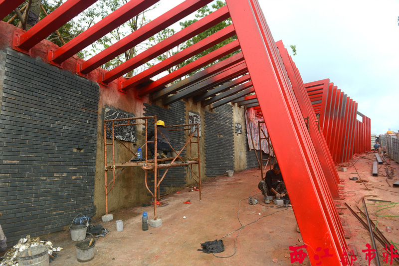 5月21日,在園博園梧州園的施工現(xiàn)場(chǎng),施工人員正在進(jìn)行特色長(zhǎng)廊的裝飾施工。