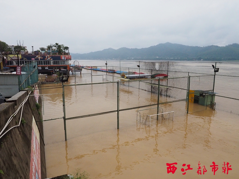 ??? 受上游地區來水和梧州市連日強降雨天氣影響,西江出現洪峰水位。5月24日中午時分,位于西堤路的河西老碼頭小型足球場和美食街一帶被淹。? 西江都市報記者 陳健新/攝