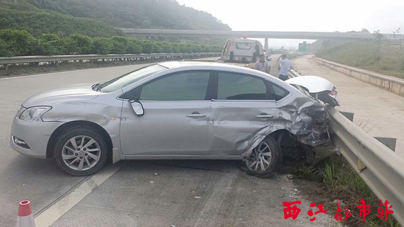 ????西江都市報訊 5月21日15時許,梧州市公安局交警支隊高速公路管理三大隊接報稱,在S50線岑羅高速0KM(羅定往岑溪方向)處發生一起小車撞向防護欄的交通事故,幸好無人員傷亡。接報后,民警火速趕往事故現場。
