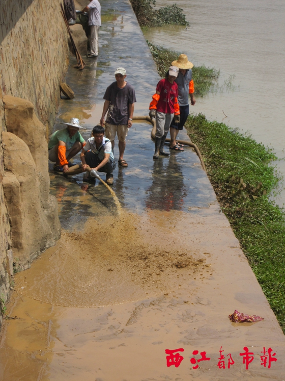 ???? 5月27日,梧州市公園管理處的職工在沖洗積滿黃泥的鴛江春泛下層亭廊。