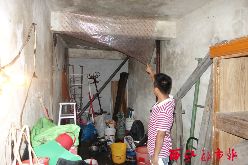 ?5月27日,廖先生向記者展示滲漏最嚴重的雜物房。 龍?zhí)靷?攝